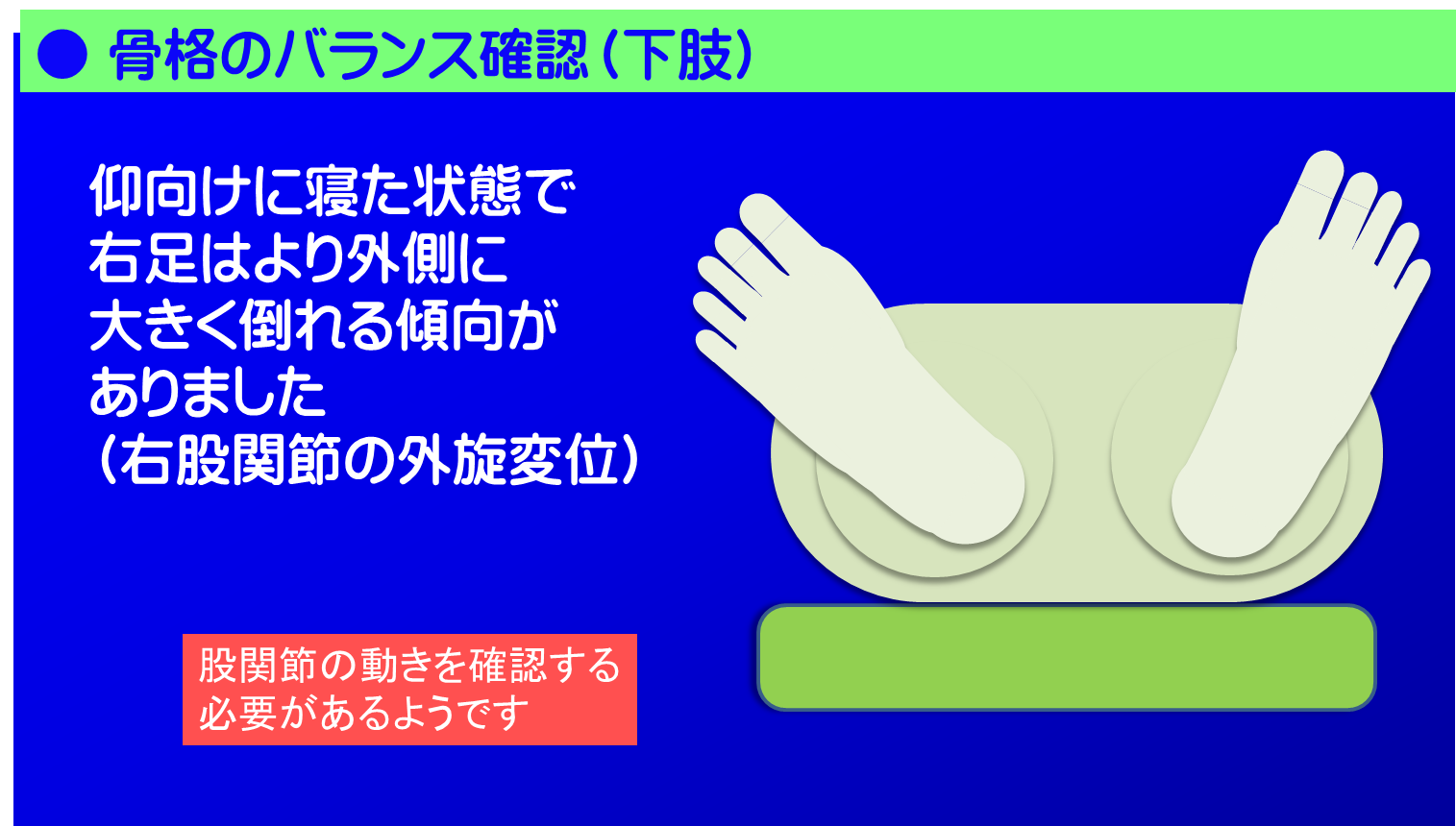 仰向けに寝た状態では、右足はより外側に大きく倒れる傾向があります(右股関節の外旋変位)。股関節の動きの確認です。