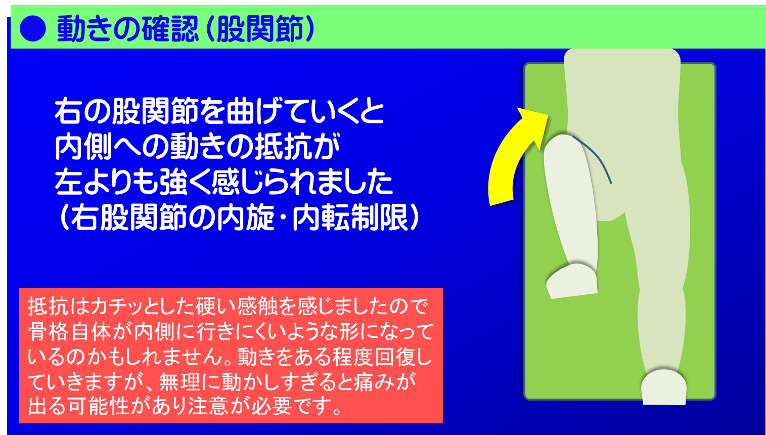 右の股関節を曲げていくと、内側への動きの抵抗が左よりも強く感じられました(右股関節の内旋・内転制限)。 抵抗はカチッとした硬い感触を感じましたので、骨格自体が内側に行きにくいような形になっているのかもしれません。