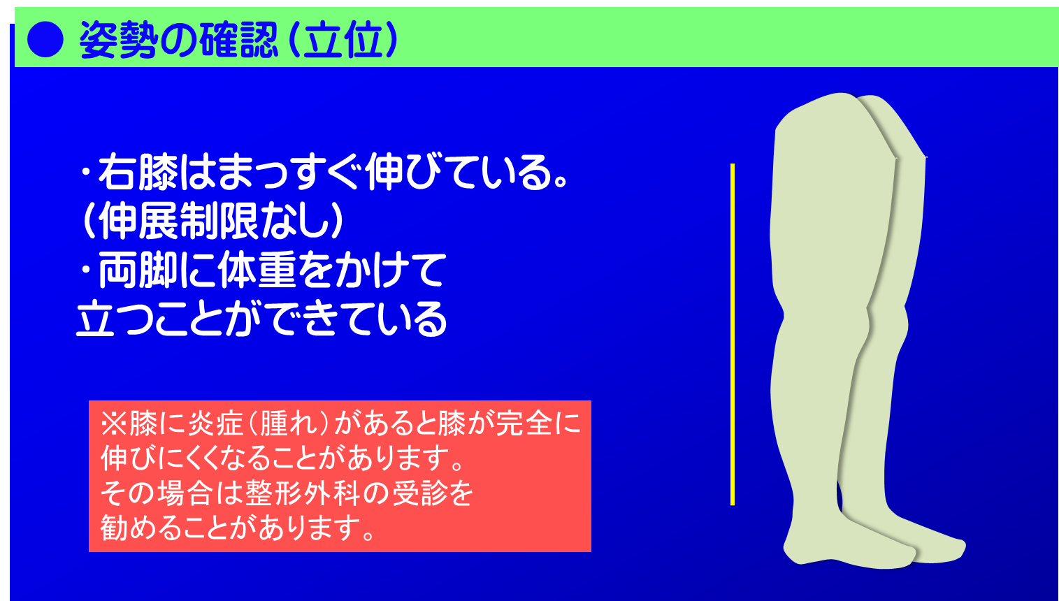 膝に炎症(腫れ)があると膝をまっすぐ伸ばしにくくなります(膝の伸展制限)。