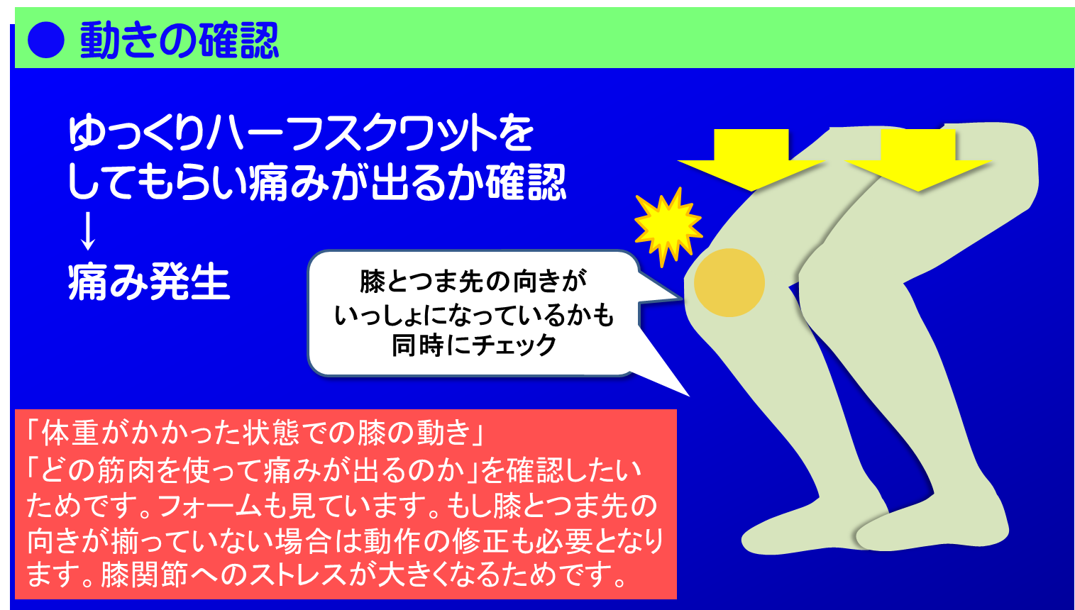 Tさんはフォームに大きな乱れはないものの、このハーフスクワットで痛みが発生しました。「階段を降りる時は痛みが出る」という話と一致します。