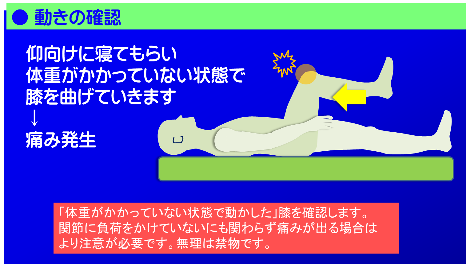 仰向けでの他動運動での膝の屈伸では痛みは出ません。前回よりも改善しています。