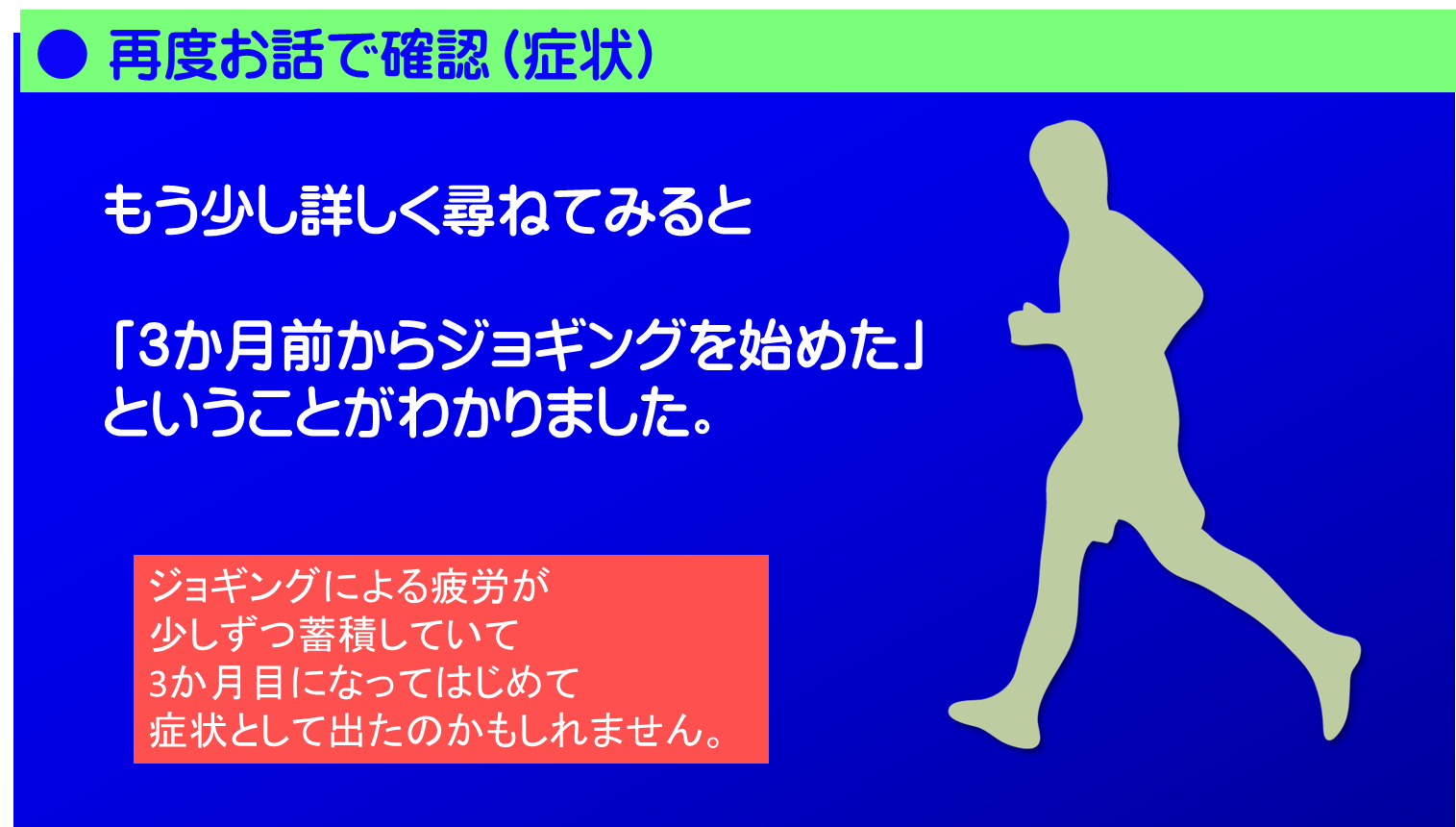 まず間違いなく、痛みの引き金はジョギングにあると考えられます。Tさん自身は「今まで問題なく走れていたので、ジョギングが原因とは考えていなかった」そうです。