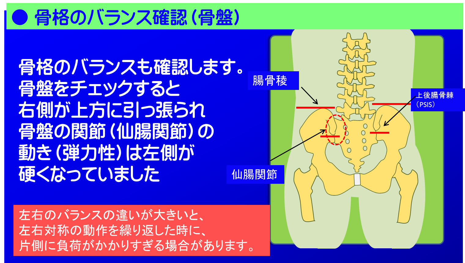 骨盤をチェックすると、右側が上方に引っ張られ、骨盤の関節(仙腸関節)の動き(弾力性)は左側が硬くなっていました。仙腸関節は数mmと小さい幅ですが可動があり、脚を通じて体に伝わってくる地面からの衝撃を和らげてくれるのです。