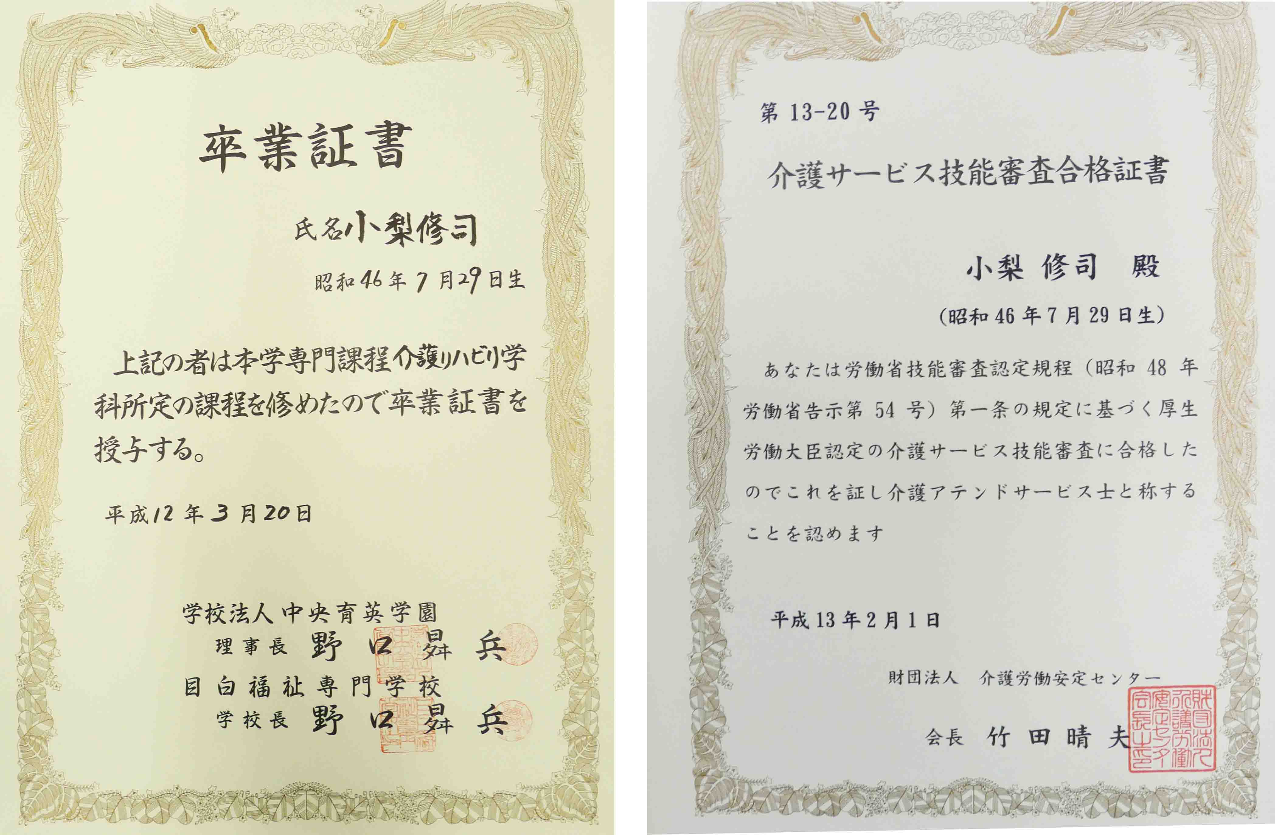 特別養護老人ホーム・グループホームなどの社会福祉施設での実習を終え卒業し、厚生労働省認定 介護アテンドサービス士 の資格を取得(※当該技能審査は平成13年3月31日に廃止)。